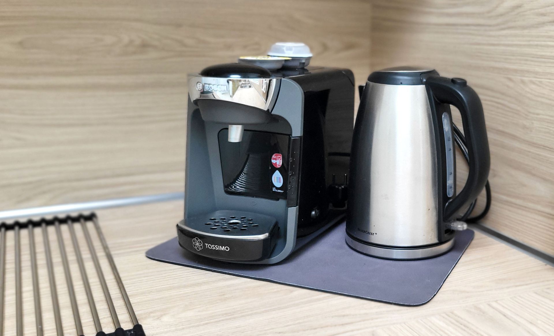 Ir pieejams arī Tassimo kapsulu kafijas automāts, parastais kafijas automāts, tosteris, vafeļu panna, tējkanna un daudz kas cits. Šeit jūs varat ērtāk pagatavot maltītes.